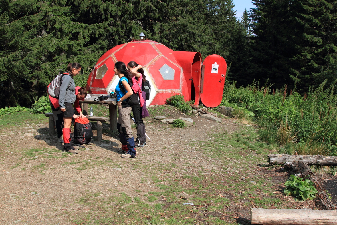 Facem o scurta pauză la refugiul de la Vârful Ascuţit apoi pornim mai departe. Mai avem de mers până părăsim creasta