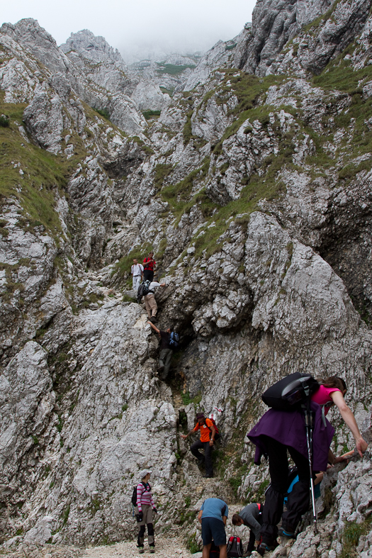 Ne salutăm cu alţi turişti care coboară. Se acordă prioritate la coborâre pe lanţuri.