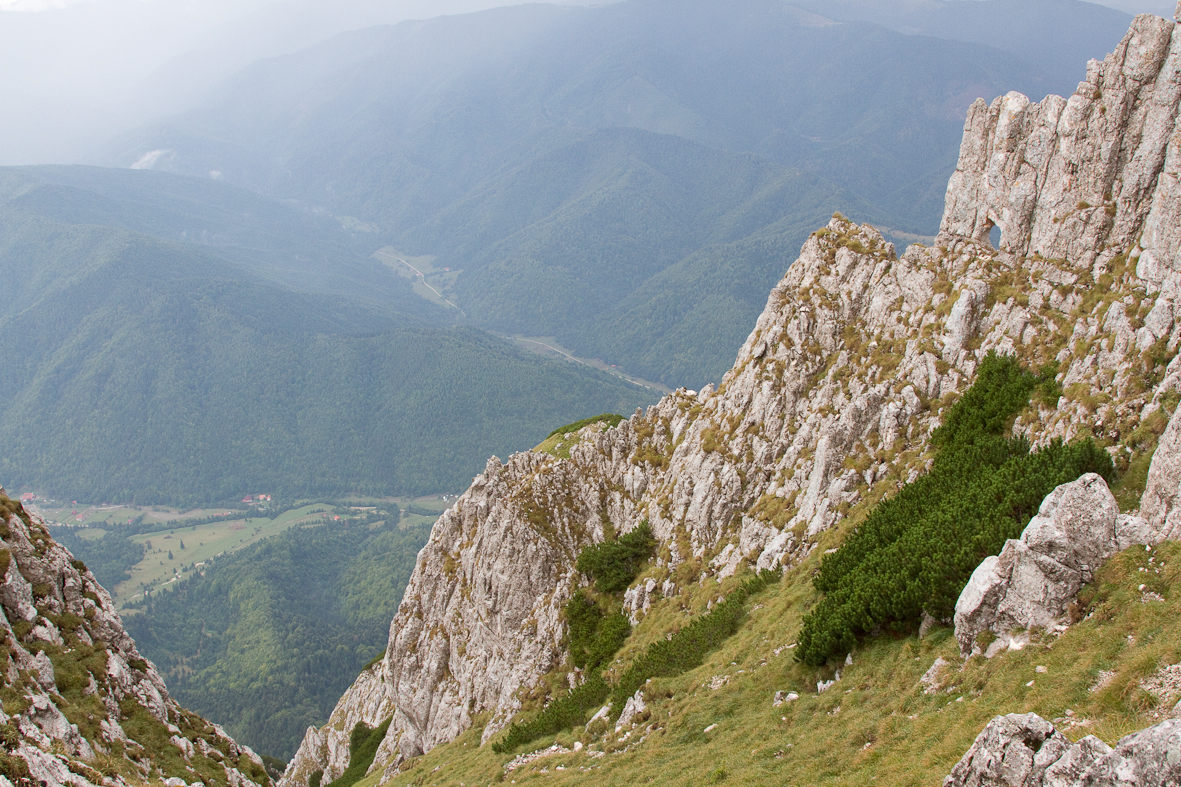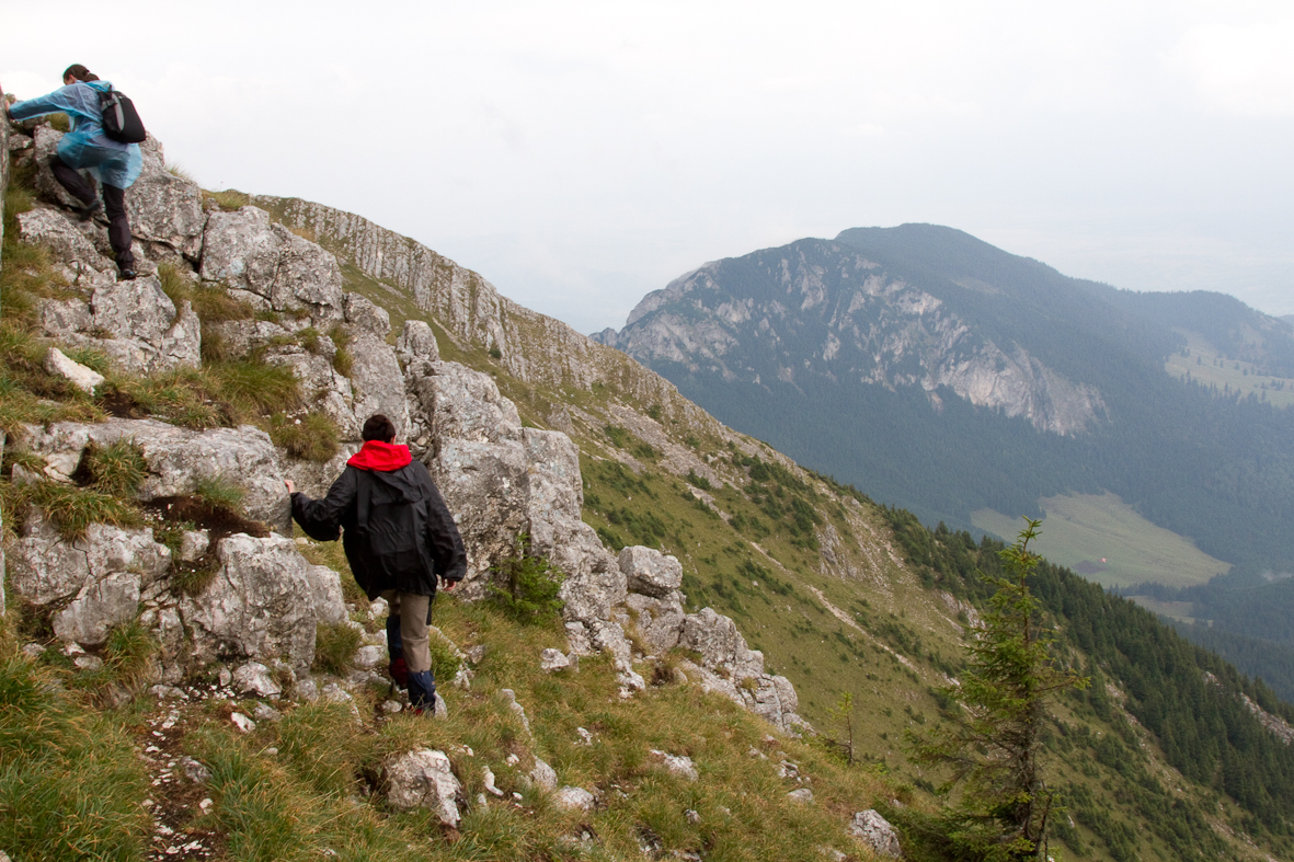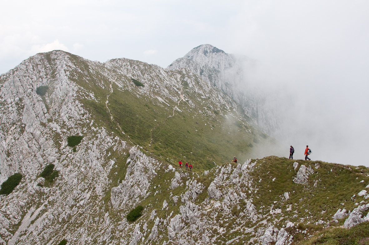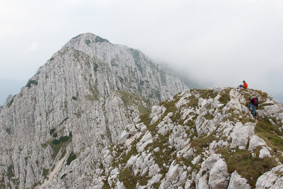Dupa atâtea hornuri fără repere sosirea în creastă se întâmplă neanunţat. Jgeabul de piatră sfărâmată se termina brusc pe un platou de câţiva metri pătraţi de iarba. Dincolo, ceaţa groasă ne împiedică să dăm ochii cu abisul de pe partea cealaltă a crestei. Pauză: realimentăm cu calorii, alţii preiau apeluri şi mesaje ce nu mai puteau să aştepte