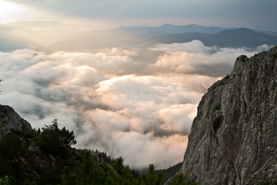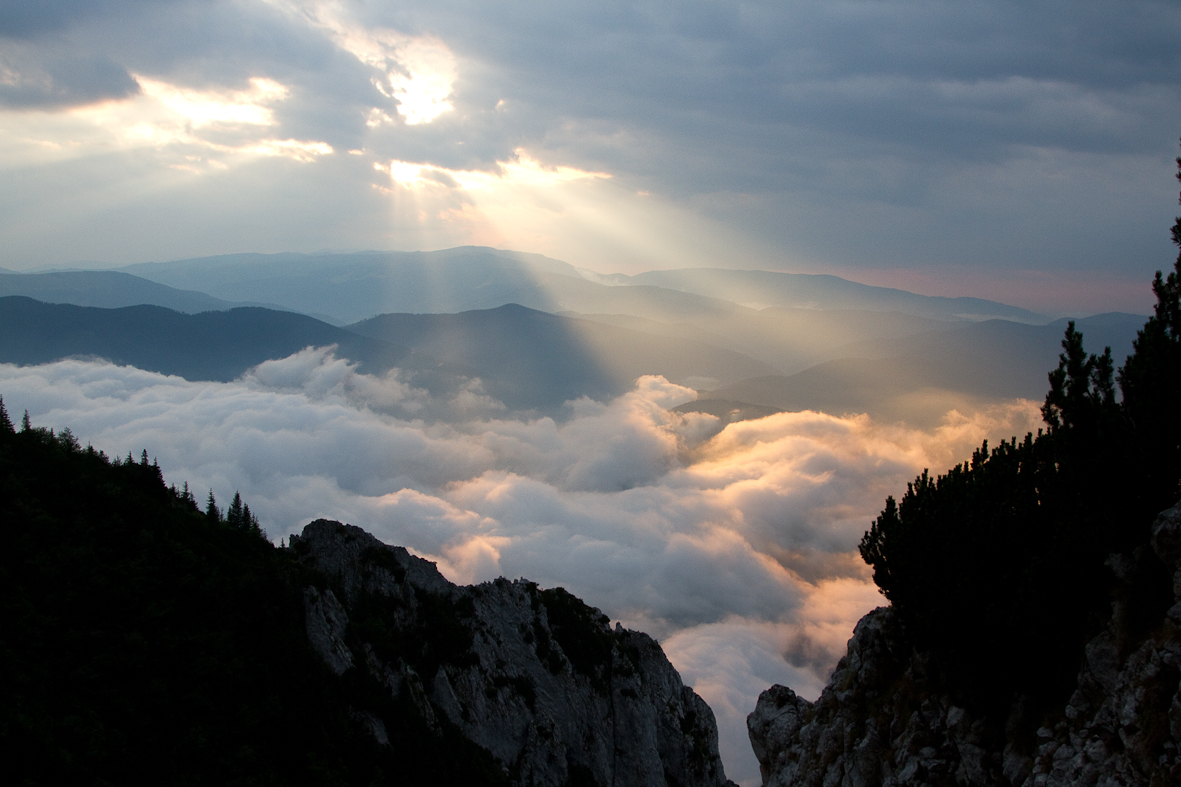 Am ajuns la locul în care părăsim Creasta. Vom coborâ spre stânga către refugiul Diana. Razele apusului luminează stratul de nori sau ceaţă în care urmează să coborâm