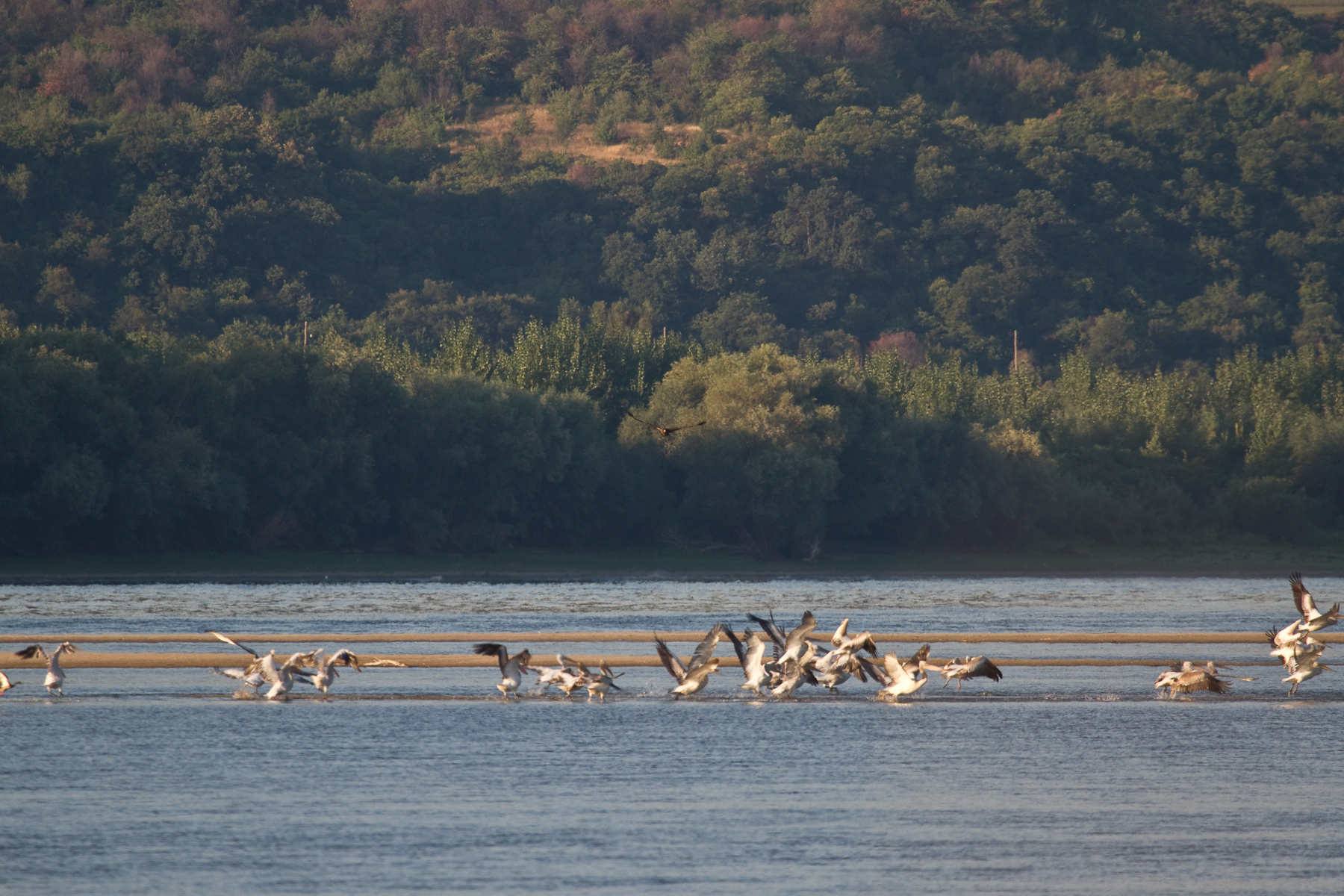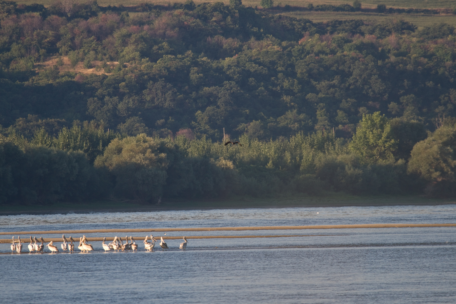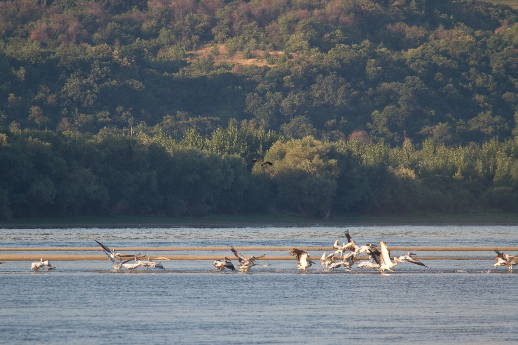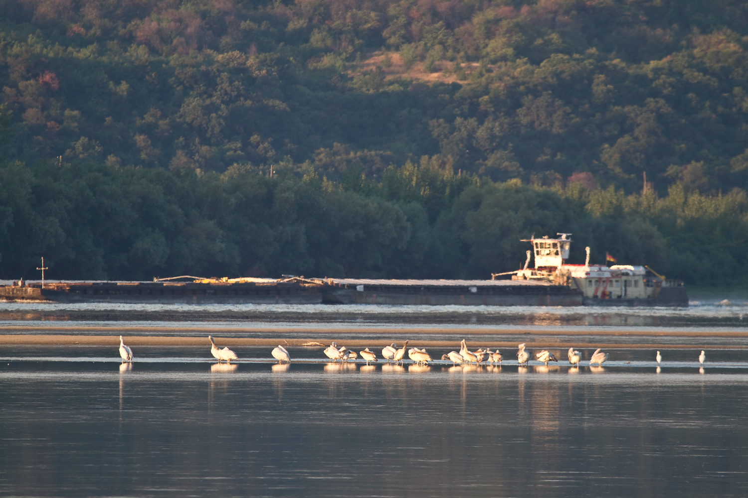 Undeva pe mijlocul Dunării un stol de pelicani leneveşte aşteptând primele raze ale soarelui.