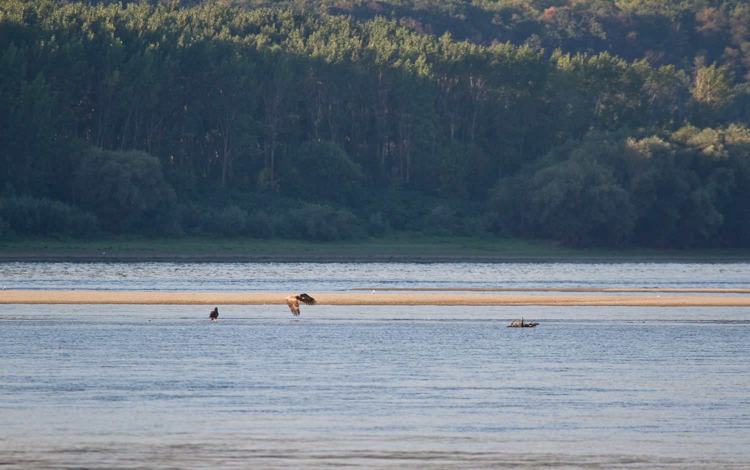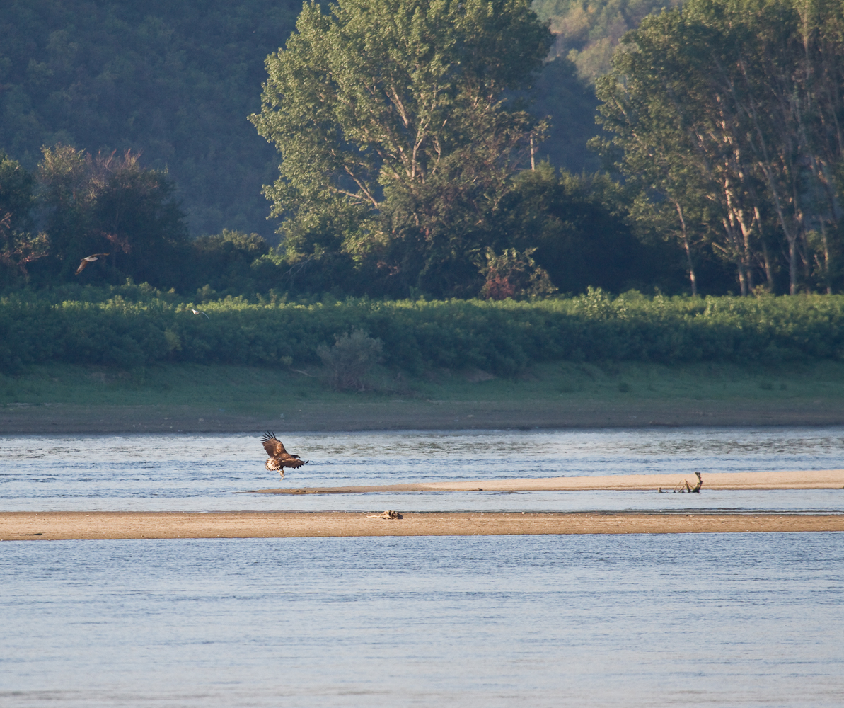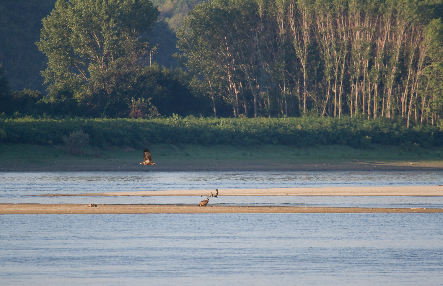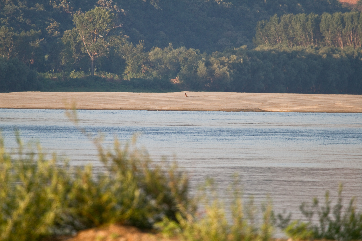 La vreun kilometru spre amonte, pe un banc mai înalt de nisip se distinge cu greu cu binoclul silueta unei păsări de pradă masive.