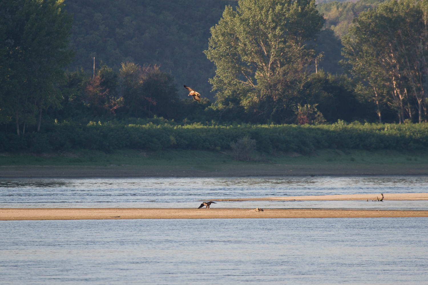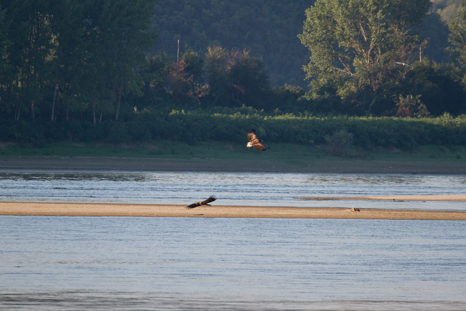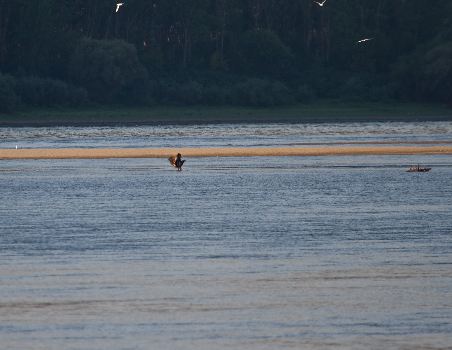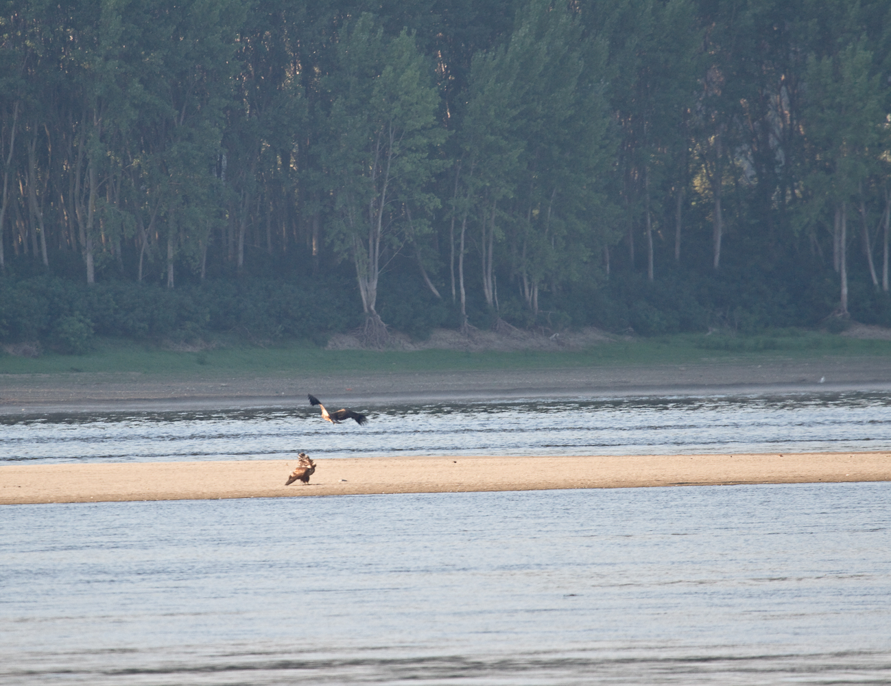 La vreun kilometru spre amonte, pe un banc mai înalt de nisip se distinge cu greu cu binoclul silueta unei păsări de pradă masive.