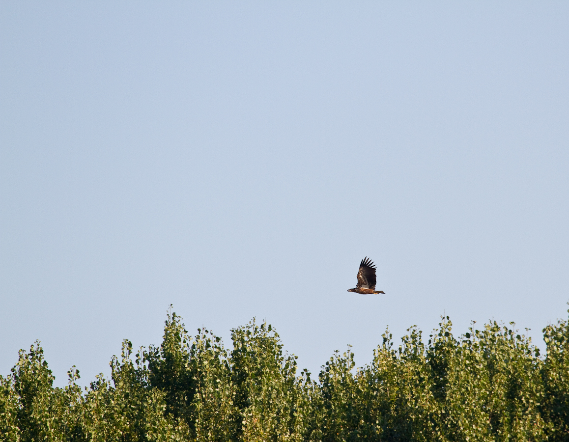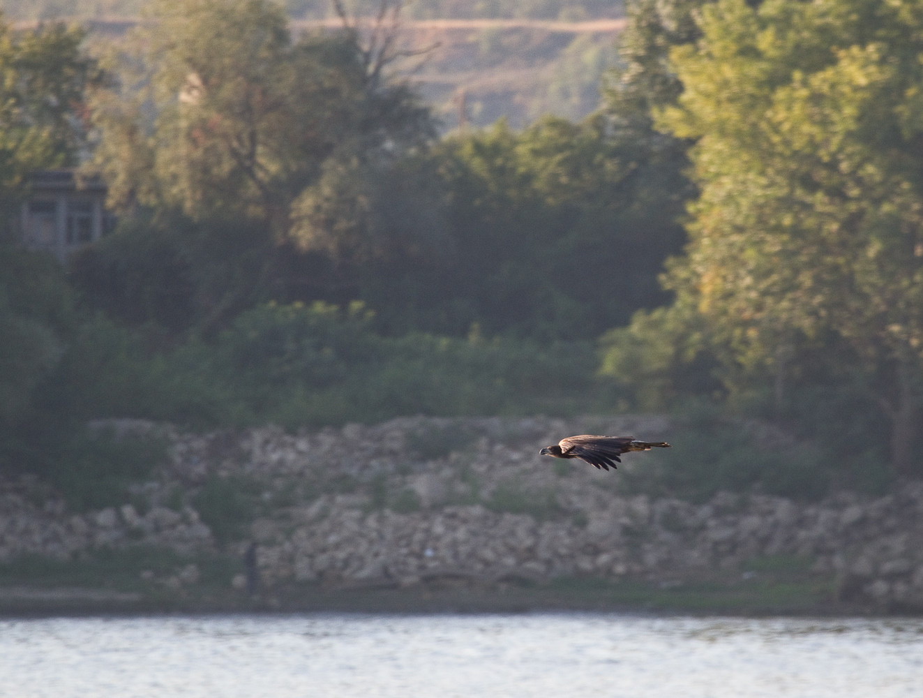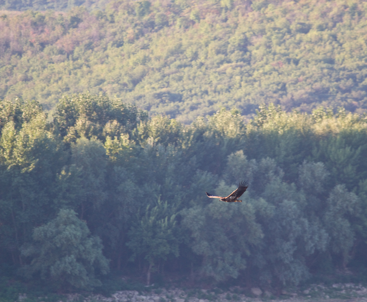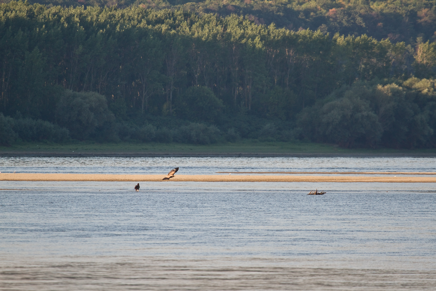 La vreun kilometru spre amonte, pe un banc mai înalt de nisip se distinge cu greu cu binoclul silueta unei păsări de pradă masive.