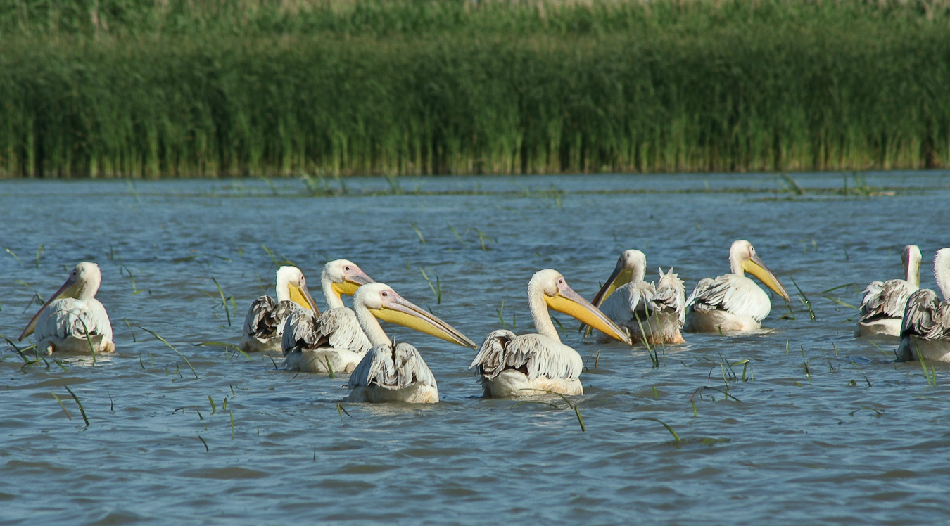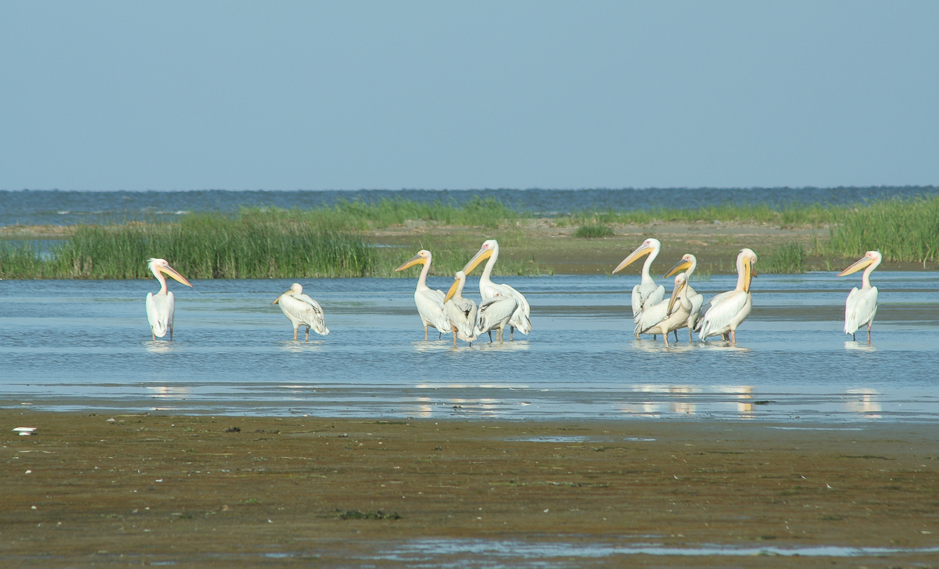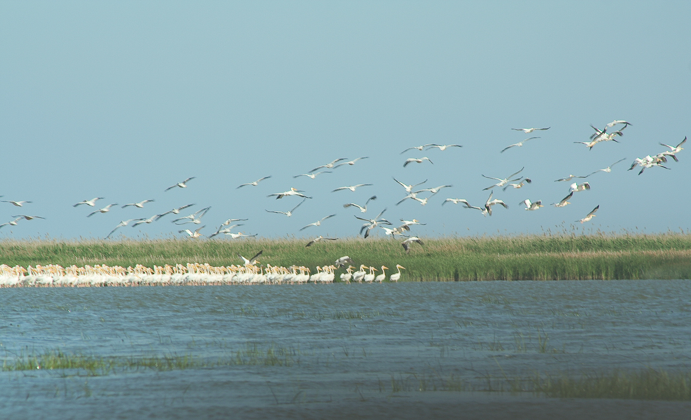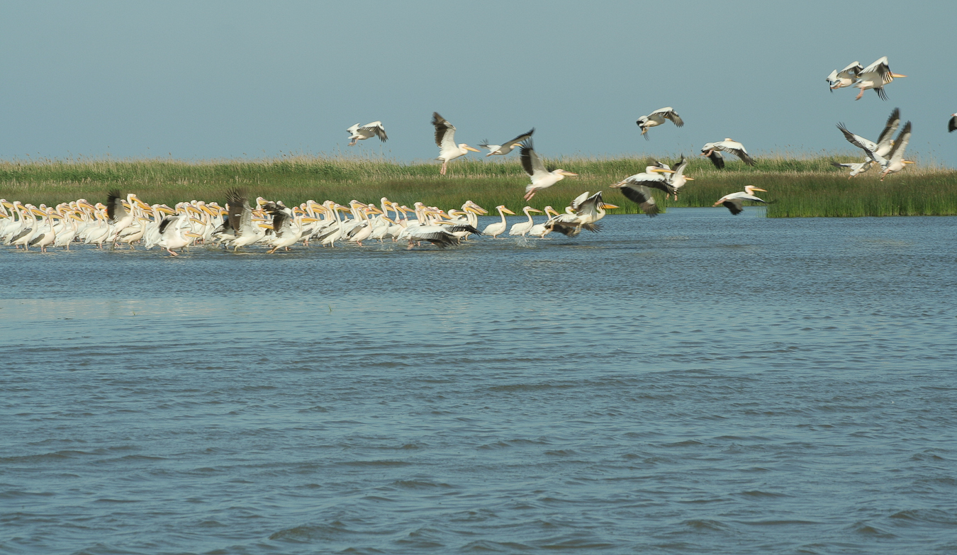 Dacă ai noroc şi pelicanii sunt adunaţi în Melea la întrarea de pe canal în lagună observi grupurile imense ca niste pete albe la orizont.