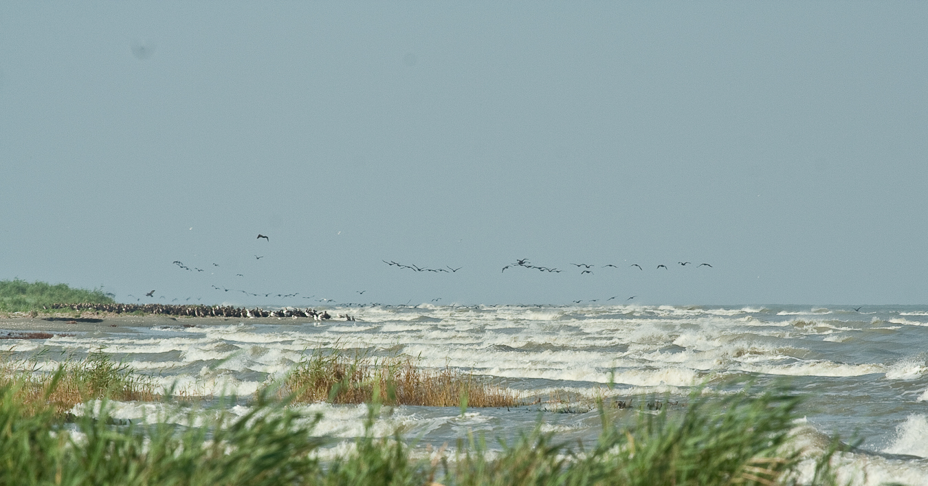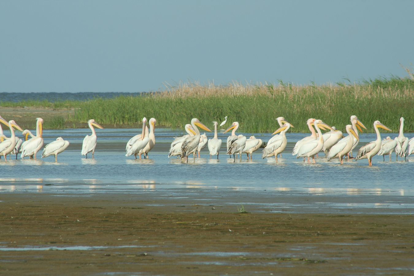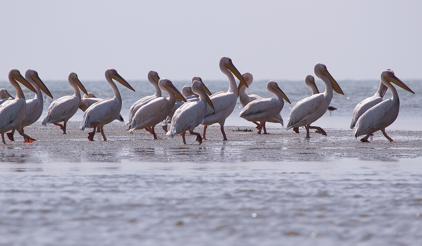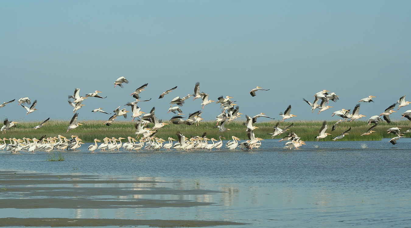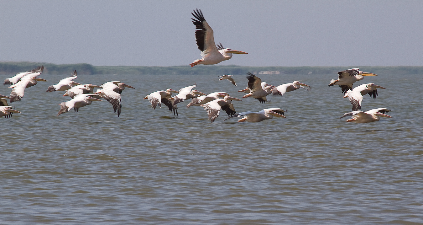 Dacă ai noroc şi pelicanii sunt adunaţi în Melea la întrarea de pe canal în lagună observi grupurile imense ca niste pete albe la orizont.