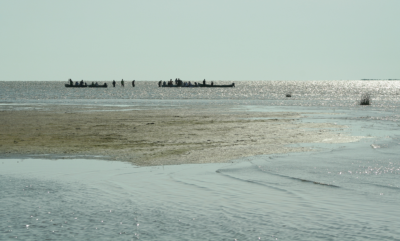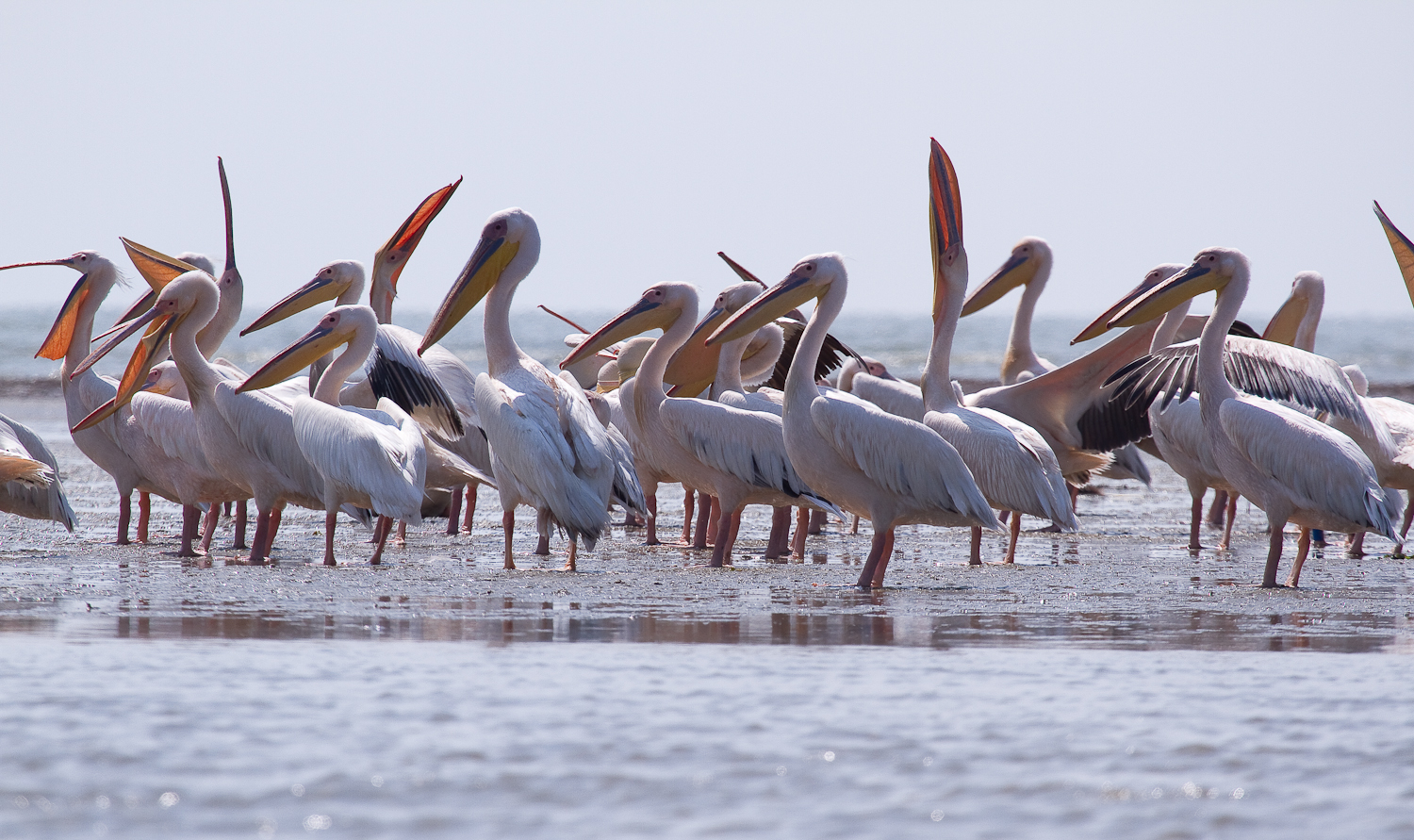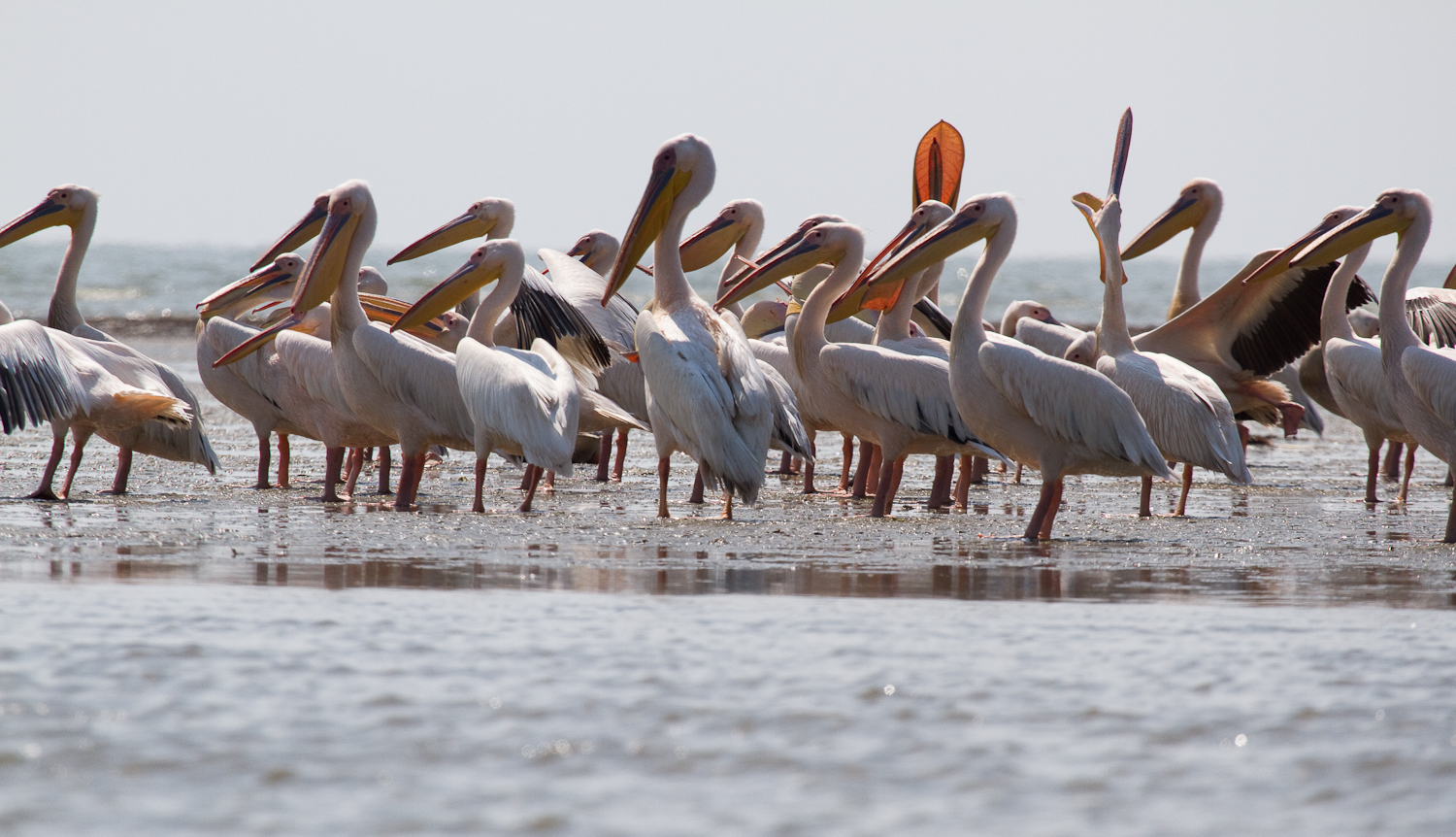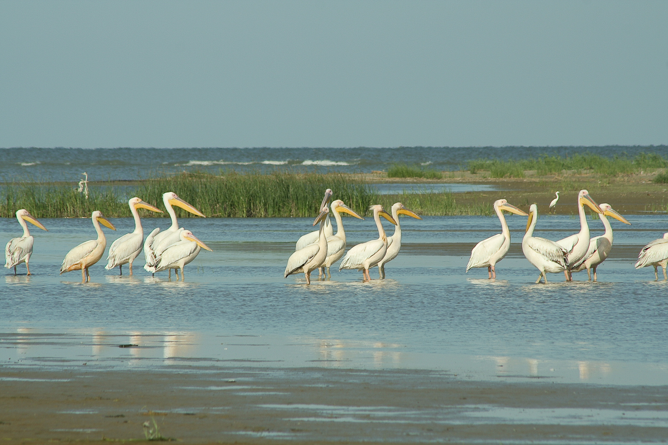 Dacă ai noroc şi pelicanii sunt adunaţi în Melea la întrarea de pe canal în lagună observi grupurile imense ca niste pete albe la orizont.