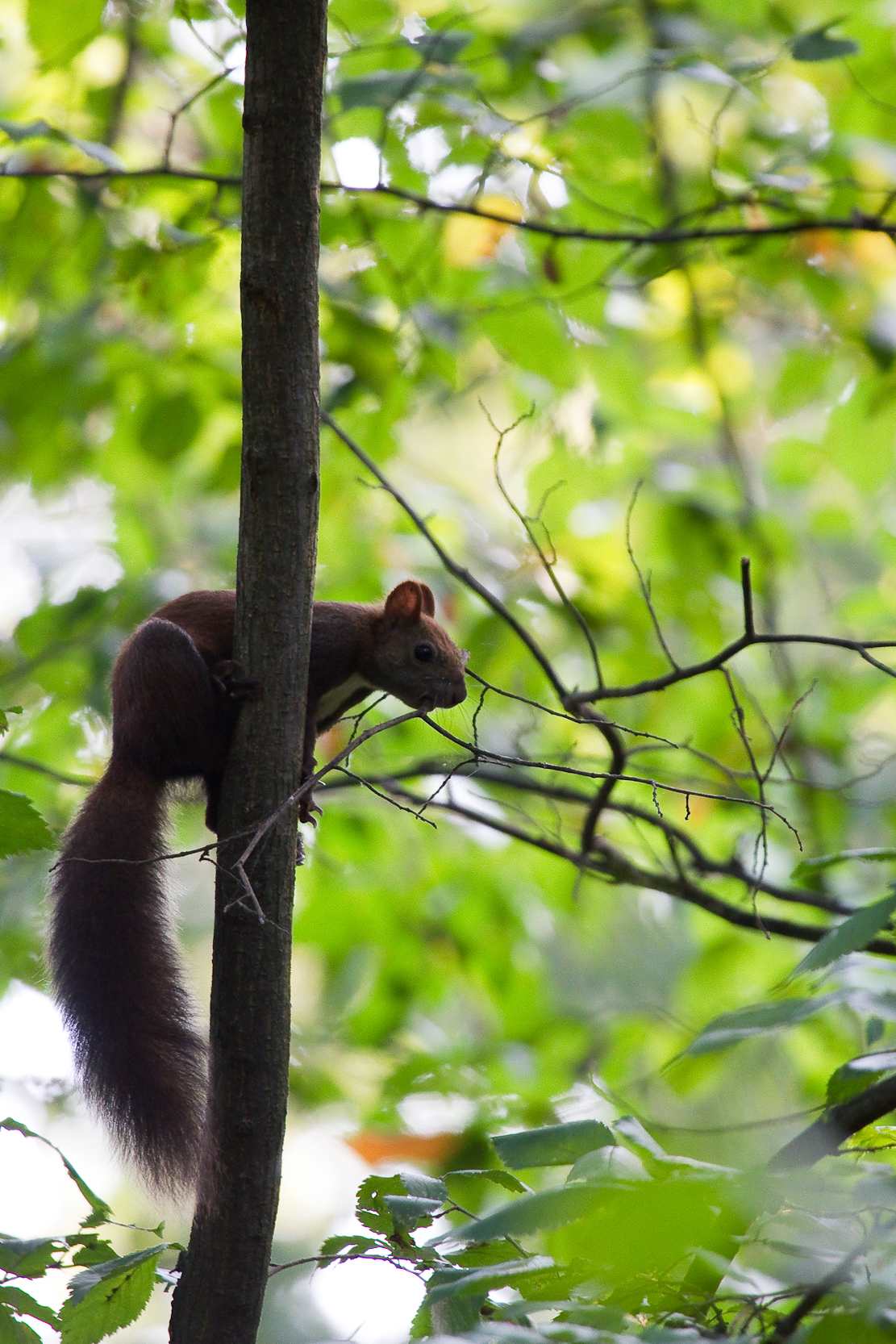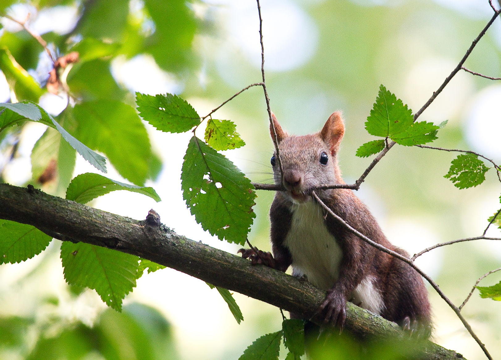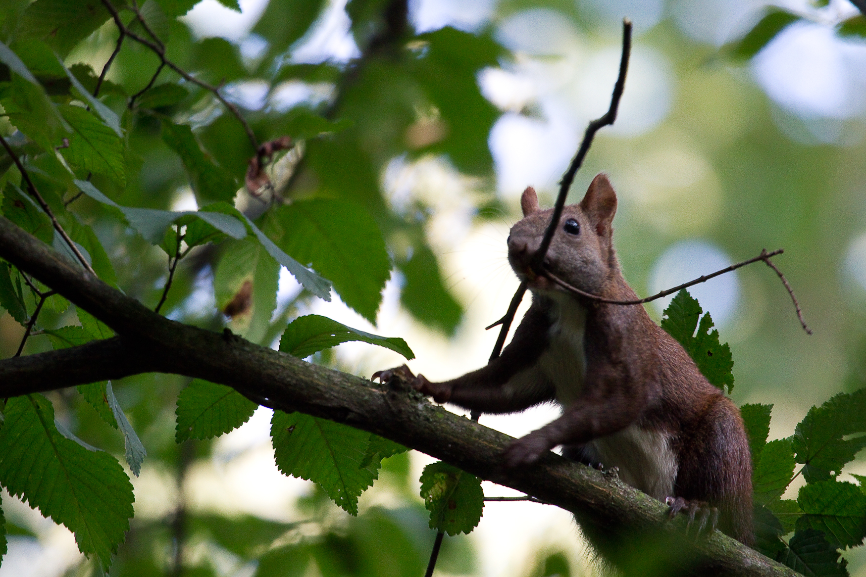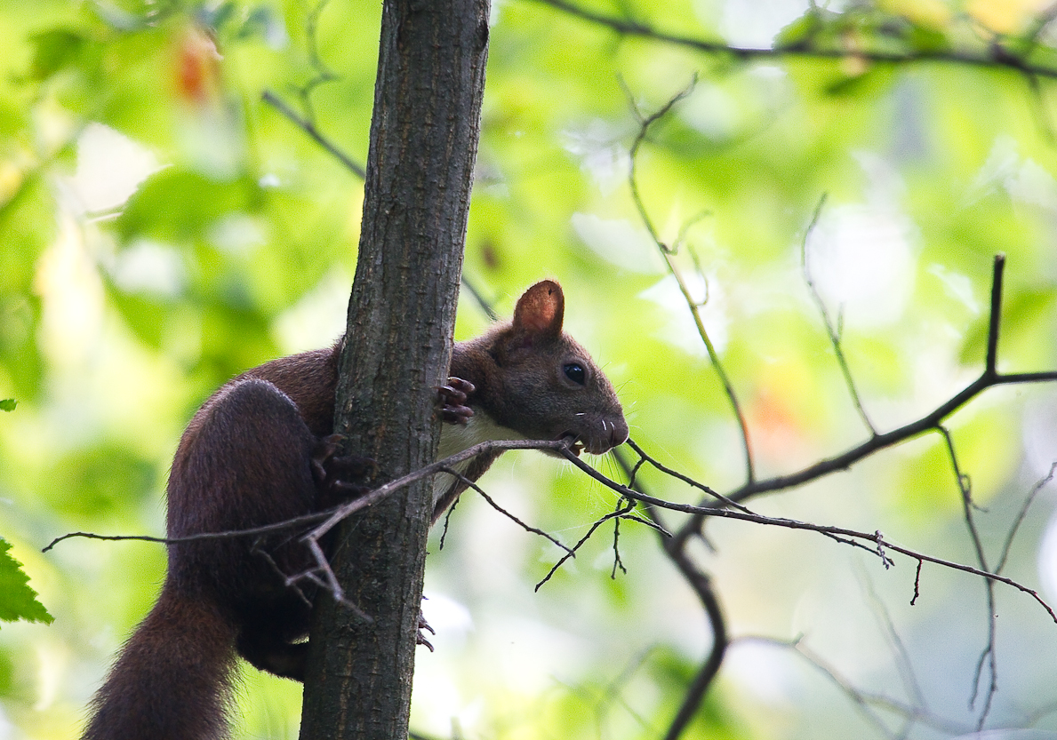 Dar acum am trecut din punct de vedere calendaristic la toamnă, suntem la începutul lui septembrie. Vietăţile ştiu asta şi se pregătesc pentru vremea ce va urma. Într-o plimbare în pădurea Comana am surprins o veveriţă care se pregatea asiduu de toamnă şi iarnă construindu-şi cuibul. Vreme de zeci de minute am asistat la munca tenace, plină de ritm, specializată a acestui animăluţ nostim. Veveriţa rupea ramuri subţiri din copaci şi apoi le ducea la cuib pentru a le ţese într-o sferă protectoare.